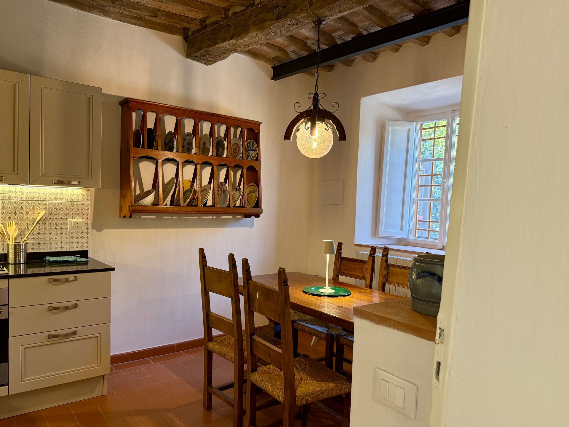 I tavoli da pranzo, in cucina ed in salotto, sono posti in prossimità delle ampie finestre ed offrono ai commensali una bella vista del giardino, della vallata e di Lucca.