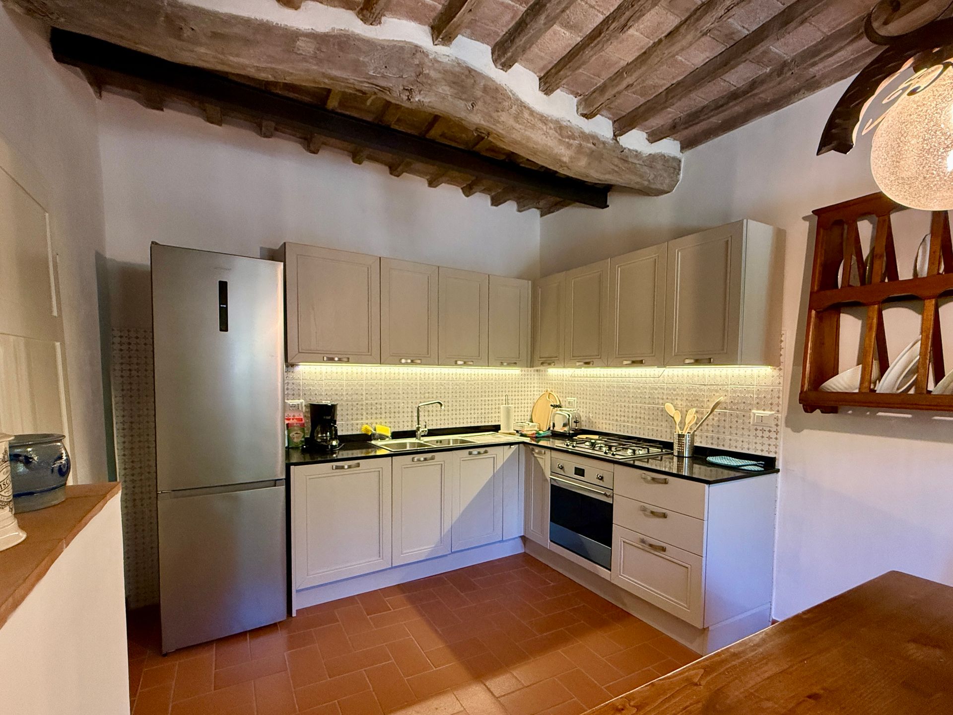 L’ingresso al pianterreno funge anche da soggiorno e da qui si accede alla bella cucina abitabile e ben attrezzata (anche di lavastoviglie e microonde), oltre che ad un comodo ripostiglio.