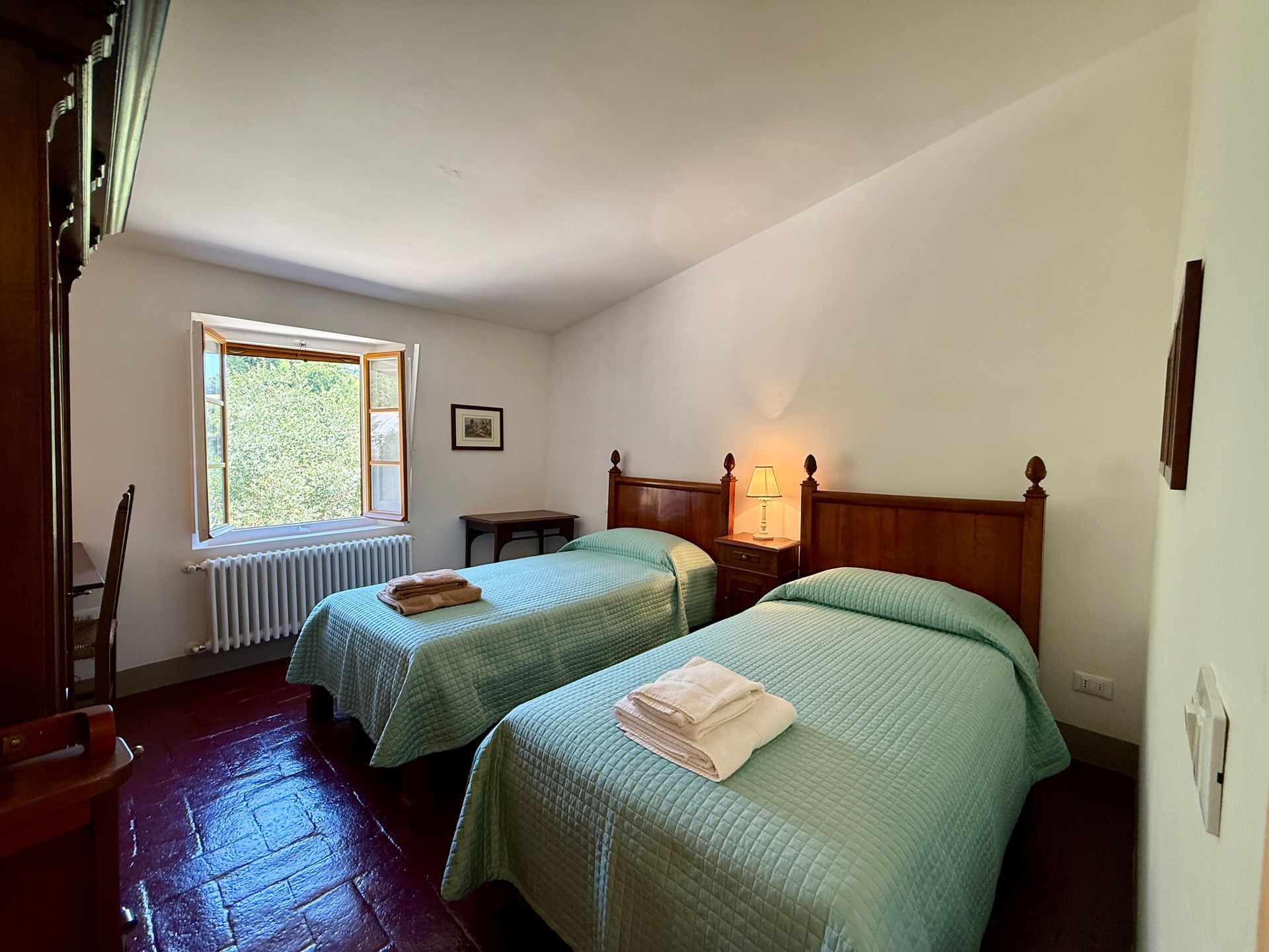 La seconda camera, anch’essa molto luminosa, ha un elegante arredamento antico con due bei letti singoli “a barca”, corredati di armadio e cassettiera. Anche il bagno di questa stanza ha due lavandini, una vasca e una grande doccia separate. La terza camera è un po’ più piccola, con due letti singoli ed un bagno con un lavandino e doccia. Anche questa camera è arredata con mobili in stile.