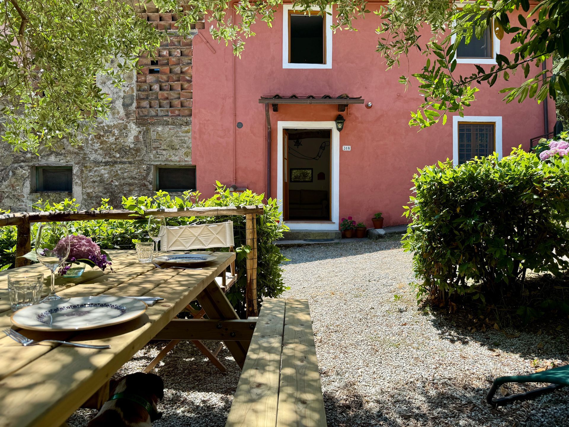 Di fronte all’ingresso dell’appartamento uno spazio attrezzato offre la possibilità di pranzare all’aperto e di organizzare un bbq all’ombra fresca degli alberi.