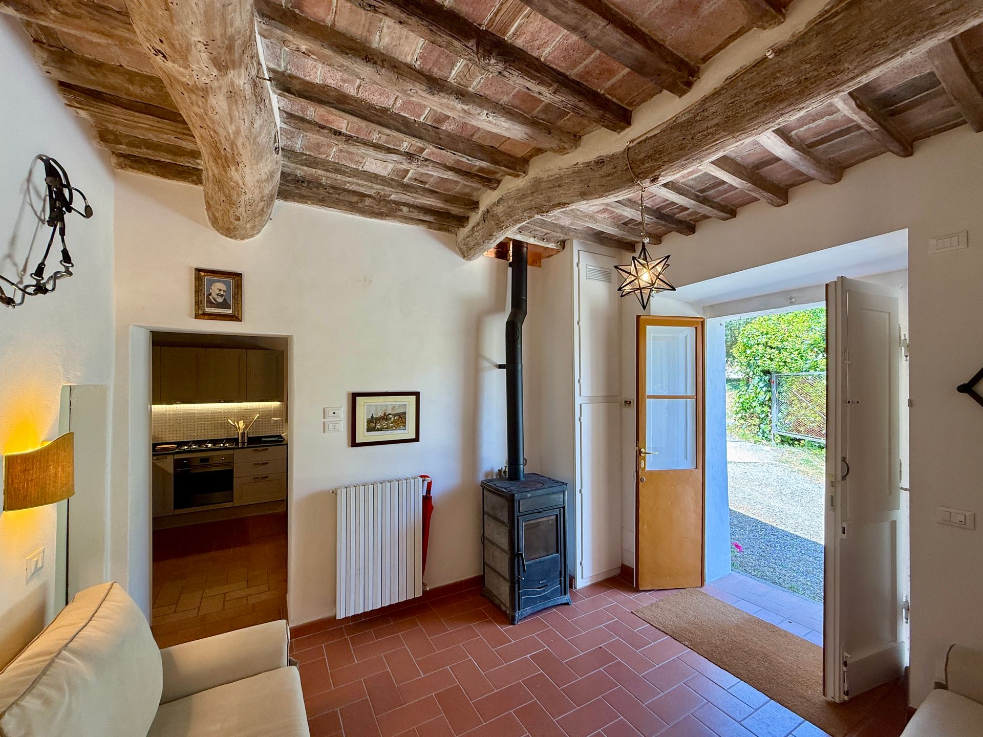 All’esterno, una bella pergola davanti alla casa permette di mangiare all’aperto immersi nel verde, godendo dell’ampio panorama. Il forno da pane ed il barbecue invece, essendo al riparo di un piccolo tetto, invogliano all’uso anche nelle giornate non solo estive.